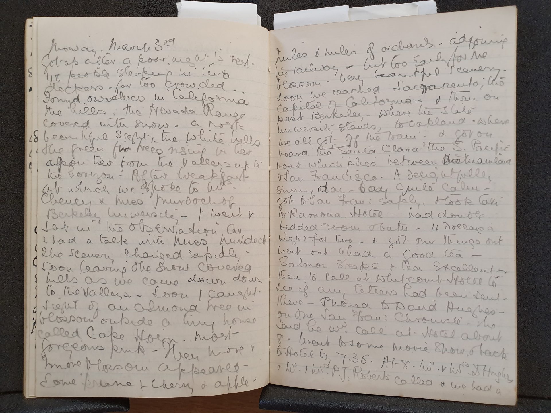 Page 38 “Got up after a poor night’s rest. 48 people sleeping in long deckers far too crowded…Found ourselves in California, the hills, the Nevada Range, covered with snow – a most beautiful sight, the white hill, the green fir trees rising in tier upon tier from the valleys up to the horizon. After breakfast at which we spoke to Mr Cheney [Sheldon Warren Cheney] and Miss Murdoch of Berkeley University – I went and sat in the observation car and had a talk with Miss Murdoch. The scenery changed rapidly, soon leaving the snow covered hills as we came down down to the valleys – soon I caught sight of an almond tree in blossom outside a tiny house called Cape Horn. Most gorgeous pink – then more and more blossom appeared – some prune and cherry and apple.”
