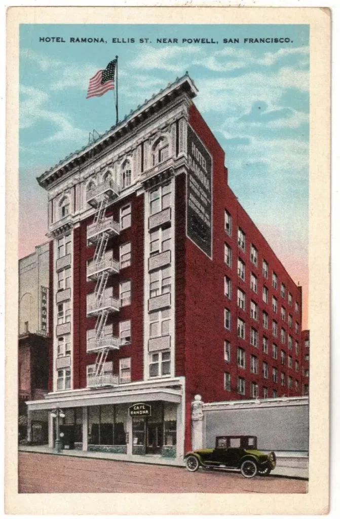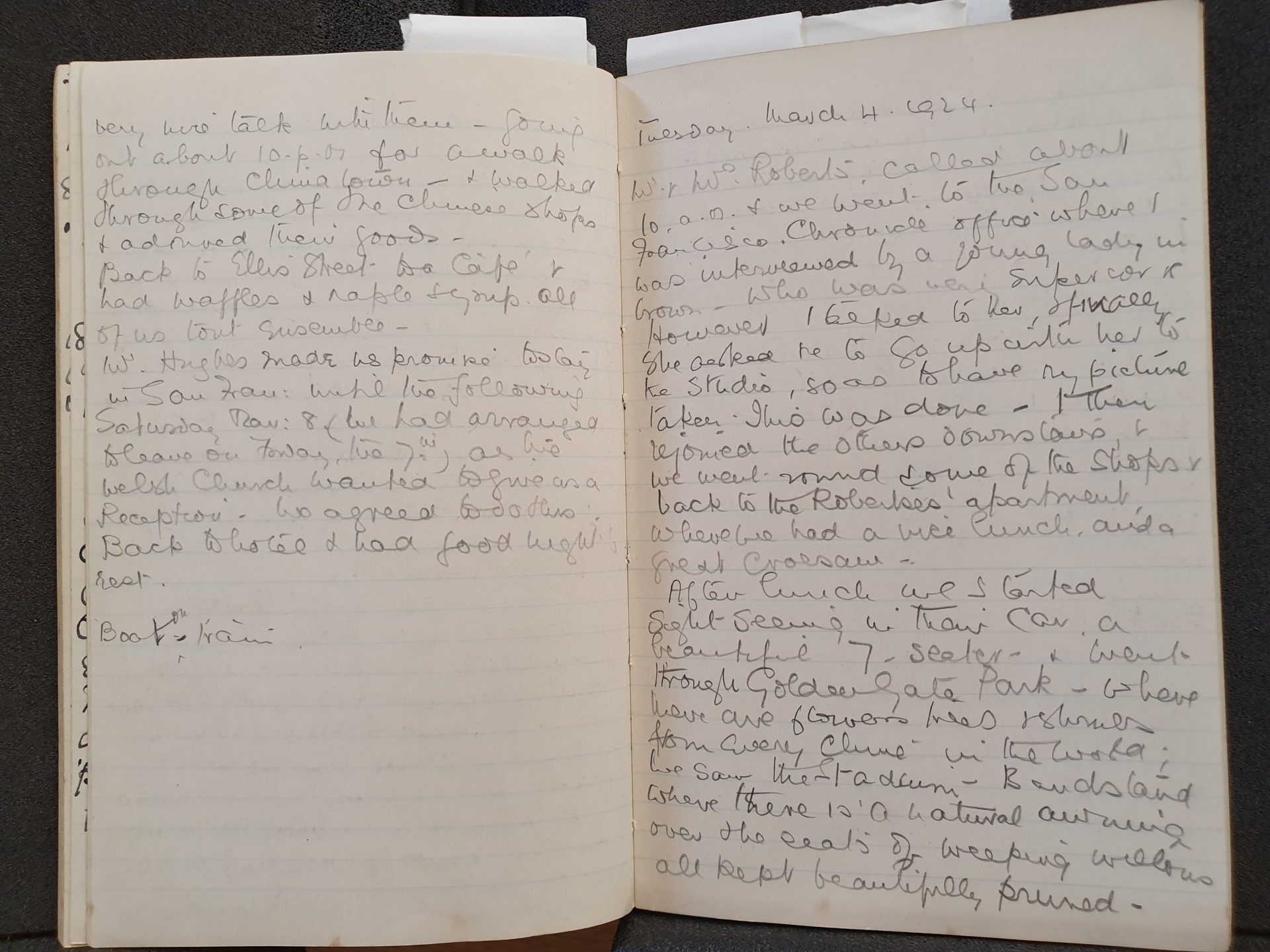“Miles and miles of orchards – adjoining the railway – but too early for the blossom. Very beautiful scenery. Soon we reached Sacramento, the capital of California and then on past Berkeley – where the State University stands, to Oakland, where we all got off the train and got on board the Santa Clara, the Southern Pacific boat which plies between the mainland and San Francisco. A delightfully sunny day, bay quite calm, got to San Fran safely and took taxi to Ramona Hotel – had double bedded room and bath – 4 dollars a night for two – and got our things out went out and had a good tea – Salmon steaks and tea excellent – then to call at Whitcomb Hotel to see if any letters had been sent there – phoned to David Hughes – on the San Fran Chronicle – who said he would call at Hotel about 8. Went to some movie show and back to hotel by 7.35.