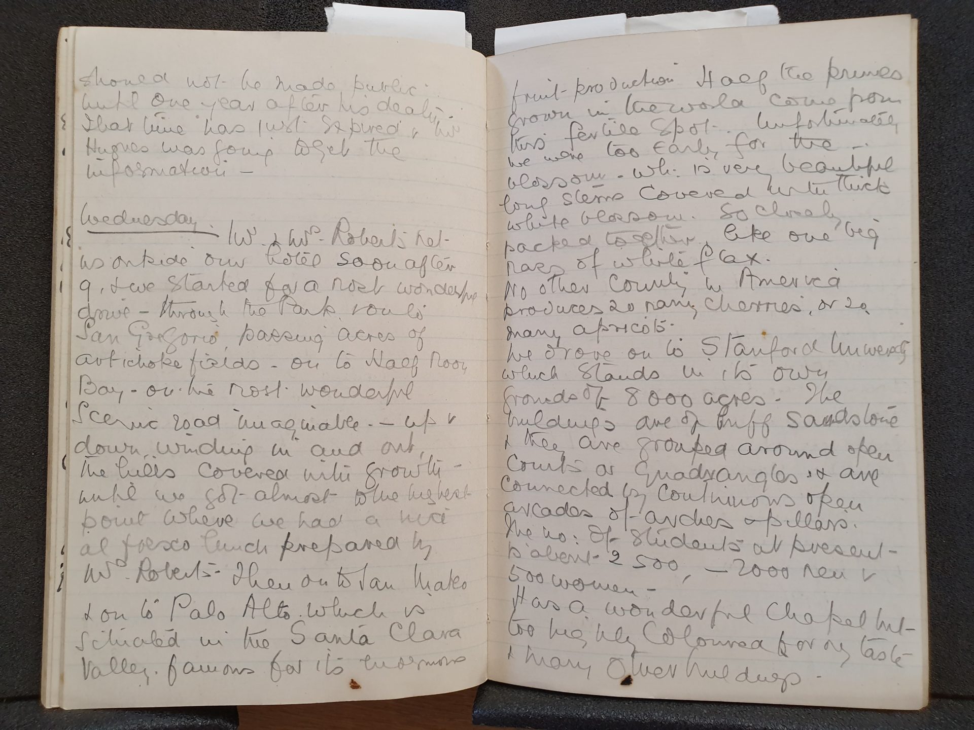 “Mr and Mrs Roberts met us outside out hotel soon after 9 & we started for a most wonderful drive – through the Park route, San Gregorio, passing acres of artichoke fields – on to Half Moon Bay – on the most wonderful scenic road imaginable – up & down, winding in & out the hills covered with growth – until we got almost to the highest point where we had a nice al fresco lunch prepared by Mrs Roberts. Then on to San Mateo and on to Palo Alto which is situated in the Santa Clara valley – famous for its enormous fruit production. Half the prunes grown in the world come from this fertile spot. Unfortunately, we were too early for the blossom, which is very beautiful long stems covered with thick white blossom. So closely packed together like one big mass of white flax. No other county in America produces so many cherries, or so many apricots.“