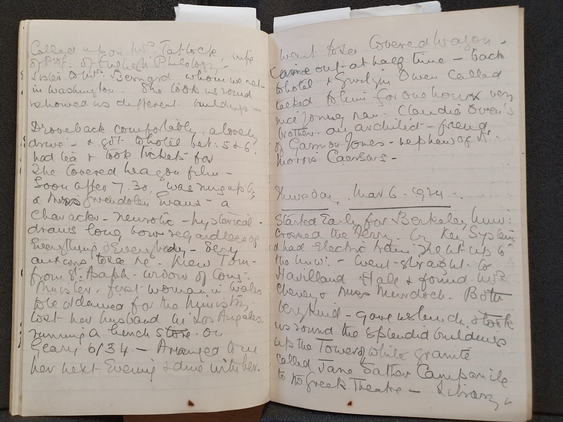 Page 42: “Called upon Mrs Tatlock [Marjorie Fenton Tatlock], wife of Prof. of English Philosophy [Prof JSP Tatlock] – sister of Mrs Bernard whom we met in Washington. She took us round & showed us different buildings – Drove back comfortably, a lovely drive & got a hotel between 5 & 6, had tea & took tickets for ‘The Covered Wagon’ film.