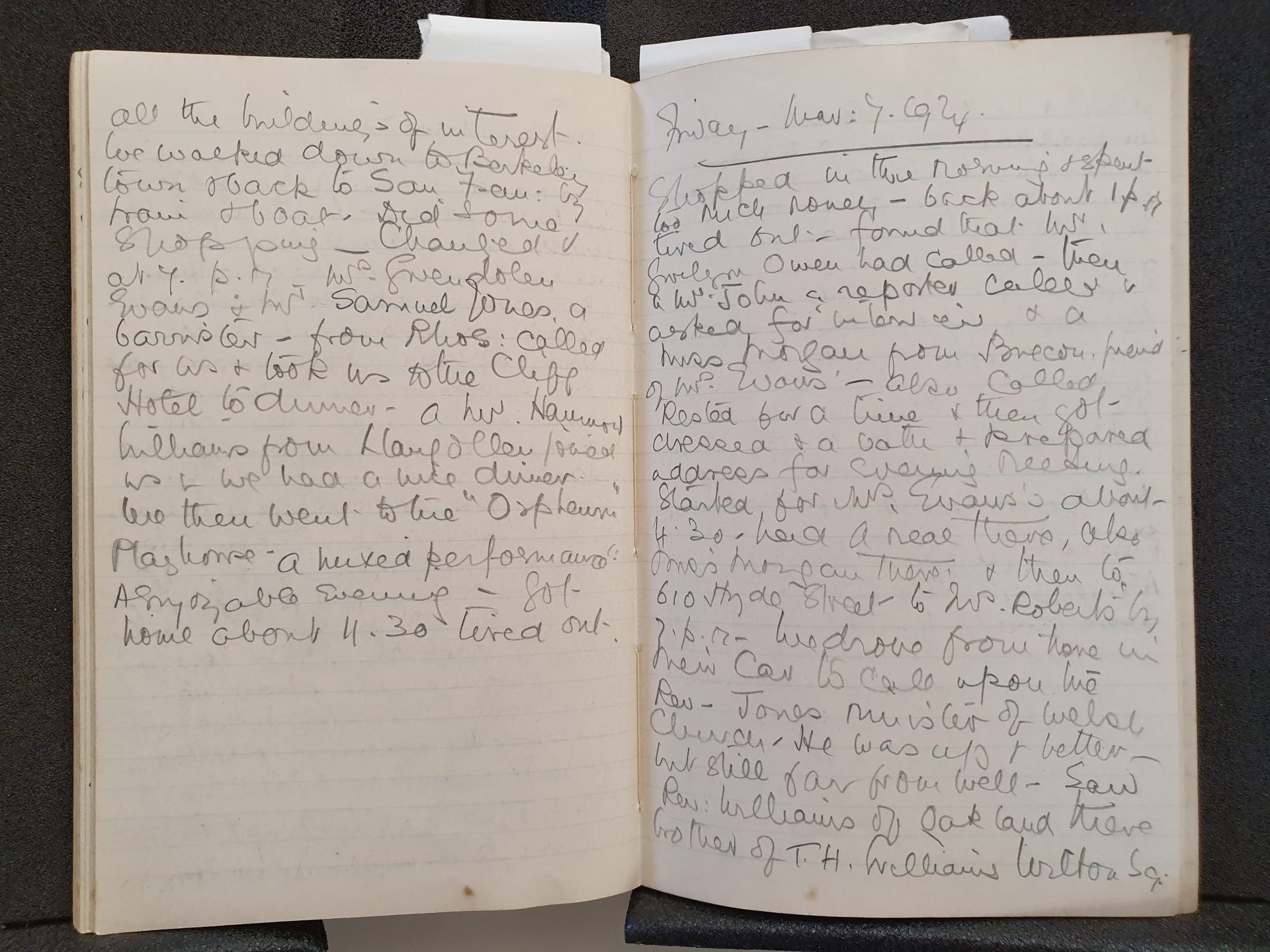 Page 43 “Mrs Gwendolen Evans & Mr Samuel Jones, a barrister – from Rhos – called for us & took us to the Cliff Hotel to dinner – a Mr Williams [Howard Williams] from Llangollen joined us & we had a nice dinner. We then went to the “Orpheum” Playhouse – a mixed performance!! A enjoyable evening – got home about 11.30, tired out.”