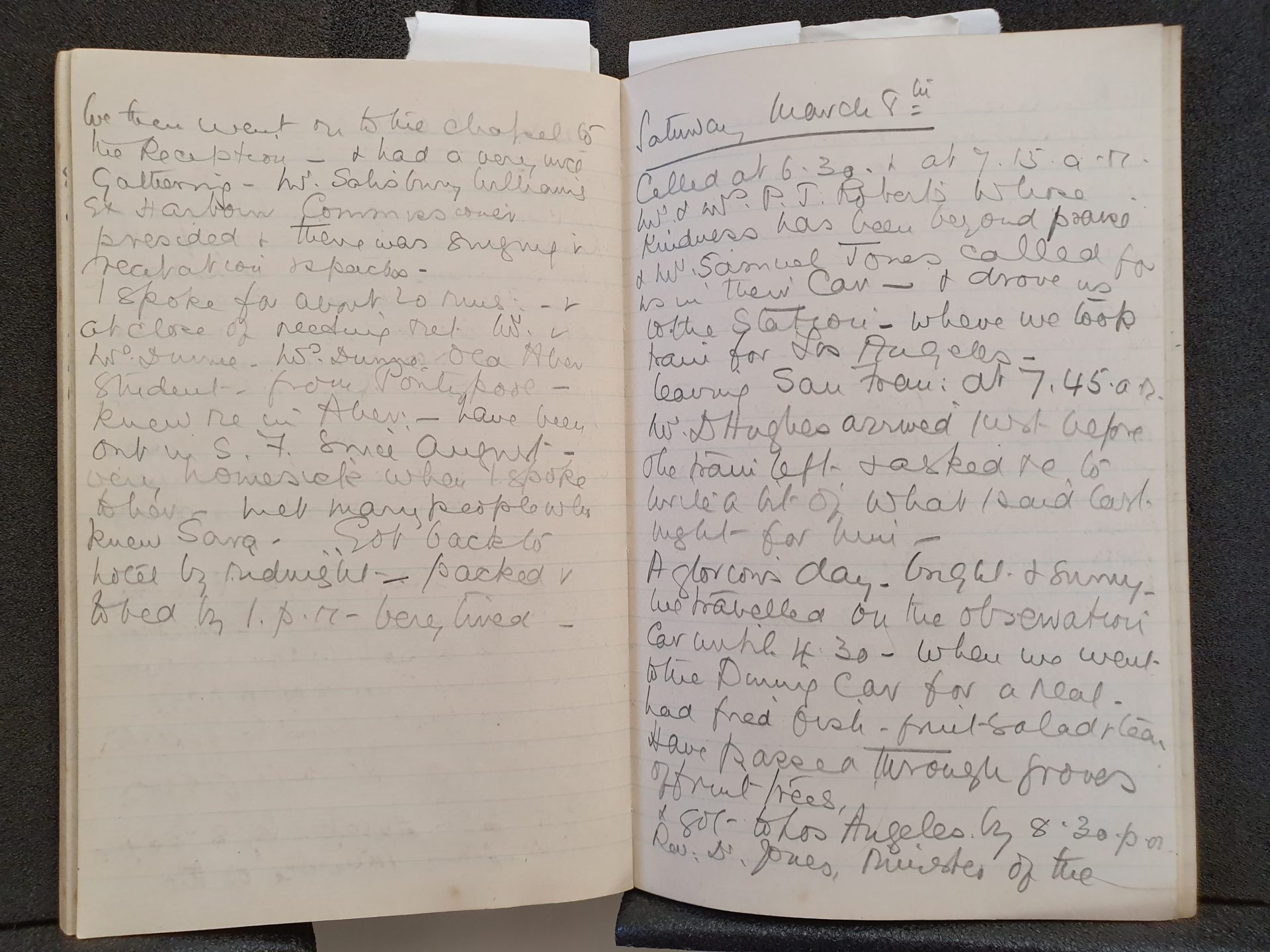 “I spoke for about 20 minutes and at close of meeting met Mr. And Mrs. Dunn. Mrs. Dunn is an old Aber student from Pontypool, knew me in Aber. Has been out in S F Since August. Very homesick when I spoke to her. Met many people who knew Sara [Annie’s Sister] Got back to hotel midnight. Packed and went to bed by 1:00 a.m. Very tired.”