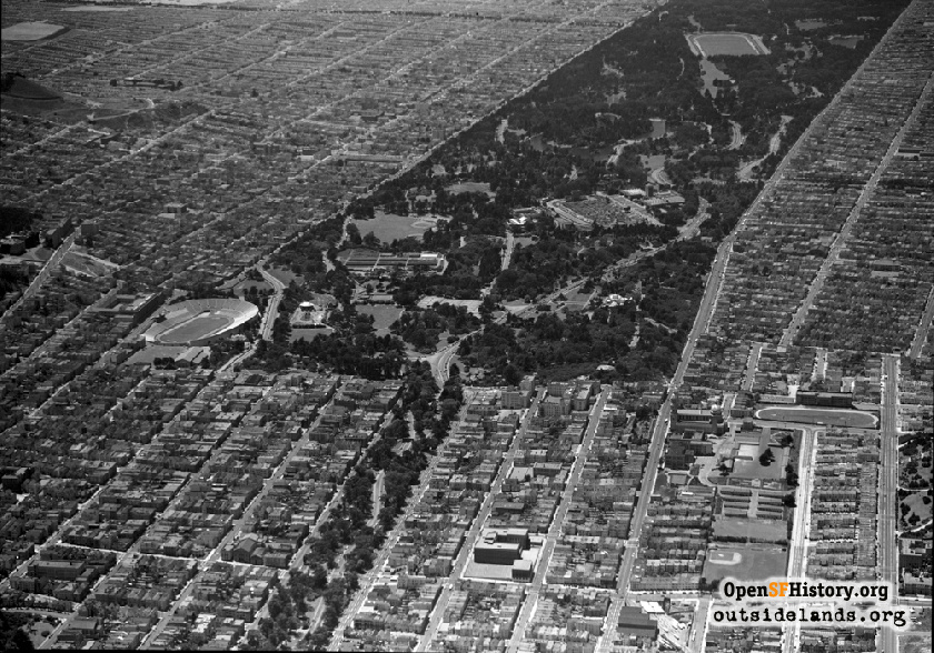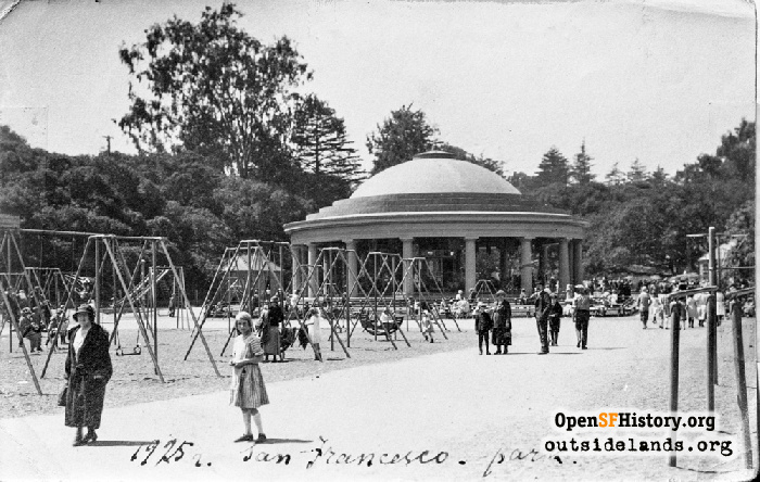 “After lunch we started sightseeing in their car, a beautiful 7 seater – and went through Golden Gate Park – where there are flowers, trees and shrubs from every clime in the world. We saw the Stadium and Bandstand where there is a natural awning over the seats of weeping willows, all kept beautifully pruned.“