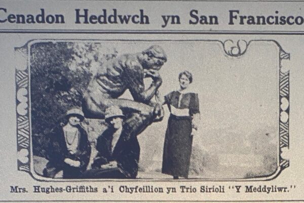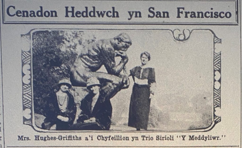 Press Clipping (from ‘Y Drych’ April 3 1924) with the statue of Rodin’s “The Thinker” in San Francisco; picturing Annie Hughes Griffiths, Gladys Melhuish Thomas and their host in San Francisco Mrs P L Roberts.