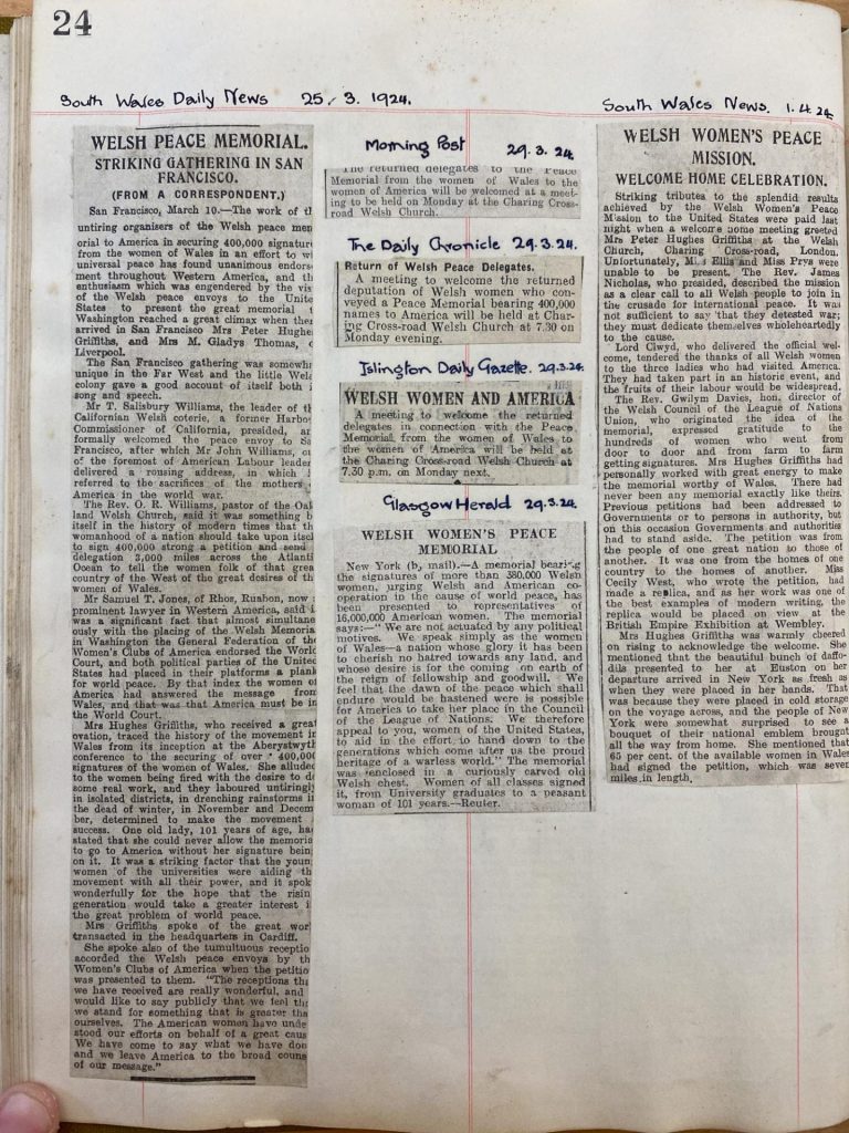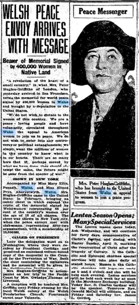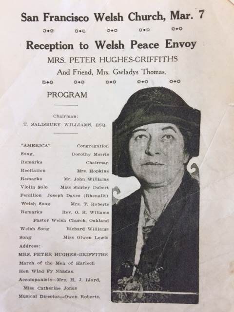 100 years ago this week, Annie Hughes Griffiths as leader of the delegation for Wales’ Peace Tour of America, spent several days in San Francisco, California, followed by Los Angeles, meeting with American Welsh communities and exploring 1920s California. Here we follow Annie’s Diary as they continue their historic ‘Peace Tour’ of the United States, culminating with Annie’s address to the Welsh Church of San Francisco on 7th March 1924.