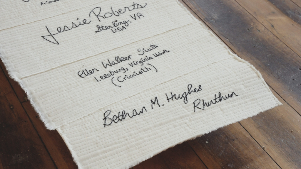 “Mae llofnodion y cyfranwyr wedi eu brodio â llaw ganddyn nhw, yn ofalus ac yn feddylgar. Rwyf i wedi eu hymgorffori yn y cwilt gorffenedig dan linellau o bwythau cwiltio sy’n efelychu’r miloedd o linellau yn y Ddeiseb. Mae pob llofnod, pob pwyth, yn deyrnged i ferched 1923/4, yn edefyn o gysylltiad, ac yn ddyhead am heddwch heddiw.