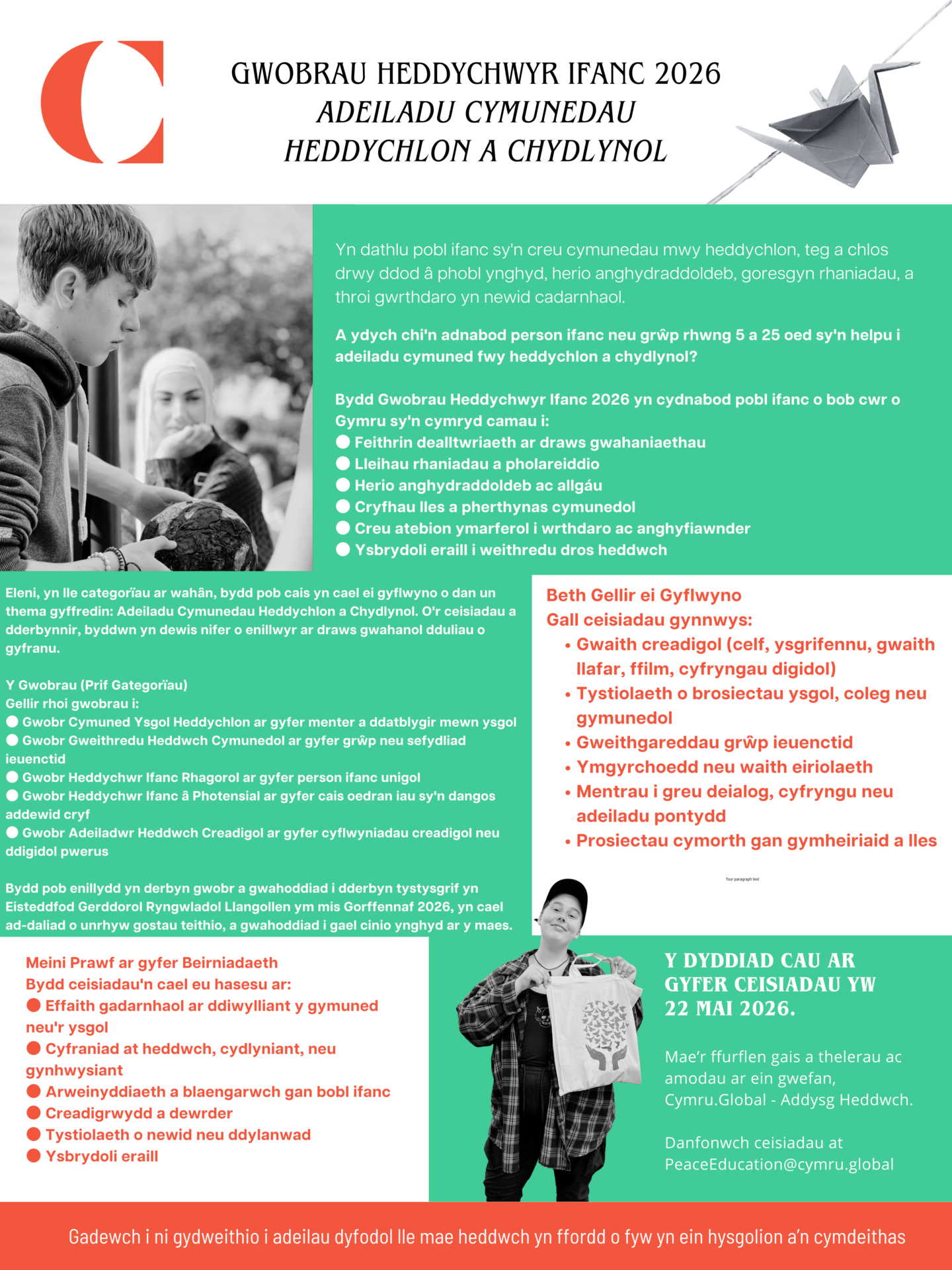 Rydym yn cydweithio i gynnal ein 9fed Seremoni Wobrwyo Heddychwyr Ifanc flynyddol yn Eisteddfod Llangollen ar y 10fed o Orffennaf 2025 lle bydd pobl ifanc yn derbyn tystysgrif a gwobr. Gall pobl ifanc unigol neu grwpiau (rhwng 5 a 25 bl. oed) gyflwyno ceisiadau o dan y categorïau canlynol, neu gallwch ddewis i enwebu rhywun hefyd!