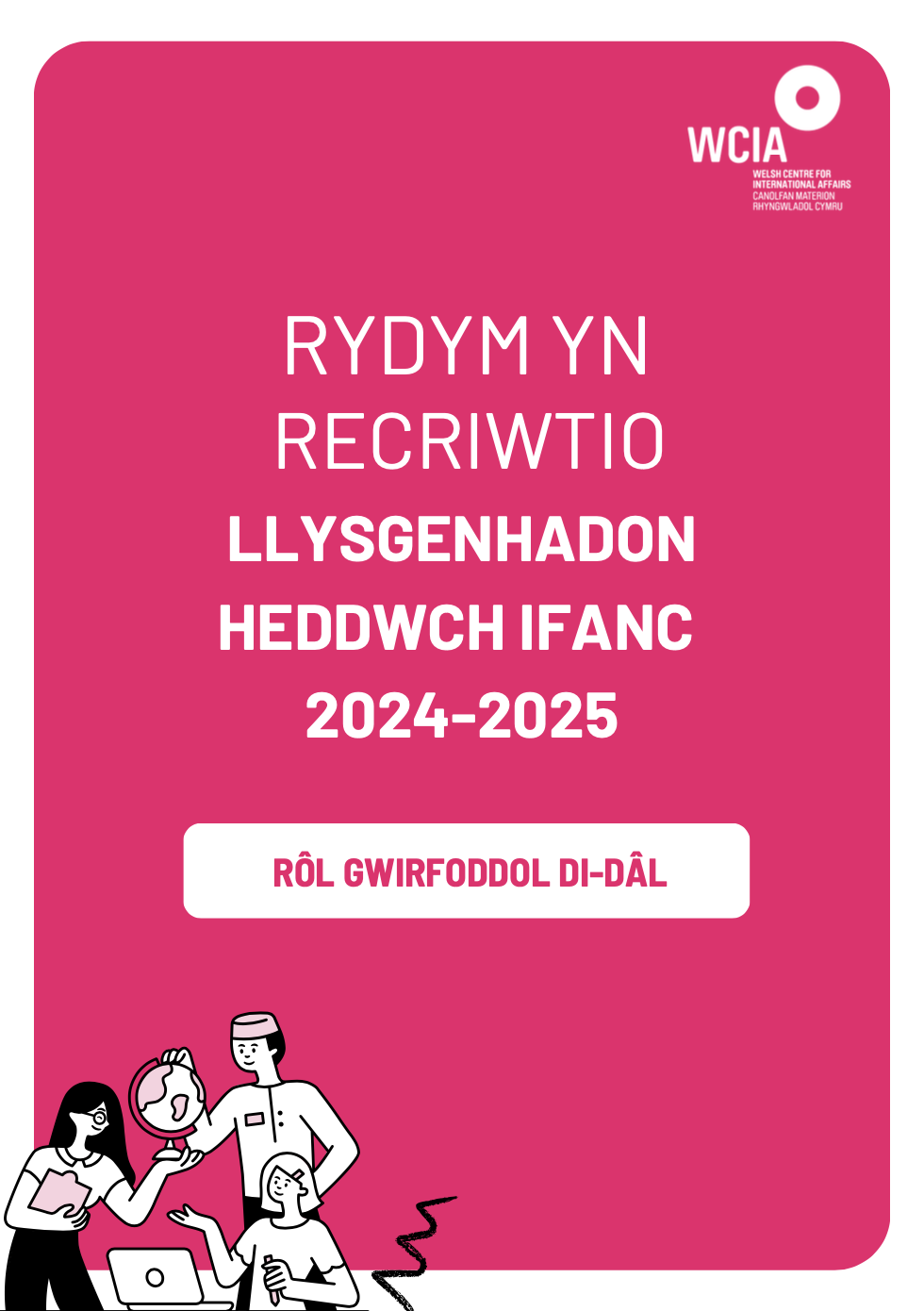 Fel Llysgennad Heddwch Ifanc, byddwch yn ymuno â rhaglen o garfan gwirfoddol blwyddyn o hyd i ddechrau, sydd wedi ei chynllunio i roi’r sgiliau a’r wybodaeth i chi i ddod yn arweinydd mewn adeiladu heddwch. Byddwch yn gweithio gyda phobl ifanc o’r un anian o gefndiroedd amrywiol, i ddatblygu a gweithredu prosiectau adeiladu heddwch creadigol sy’n mynd i’r afael â heriau’r byd go iawn yng Nghymru ac yn fyd-eang.