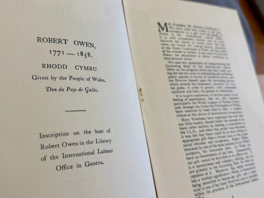 Ym 1929, yn dilyn y momentwm o Ymgyrchoedd Coffa Heddwch blaenorol a arweiniwyd gan Fenywod Cymru rhwng 1923-4, ac Eglwysi Cymru rhwng 1925-6, rhwng 1928-29, cydlynodd Undeb Cynghrair y Cenhedloedd Cymru ag Undebau Llafur a chyrff eraill i greu deiseb goffa a penddelw efydd o’r diwygiwr cymdeithasol Robert Owen , a aned yn Newtown, Powys, i bencadlys y Sefydliad Llafur Rhyngwladol (ILO) yn Geneva – lle mae’n parhau i fod ar ddangos hyd heddiw yn Llyfrgell yr ILO , fel symbol o ddymuniad Cymru i chwarae rhan weithredol ymhlith cenhedloedd y byd.