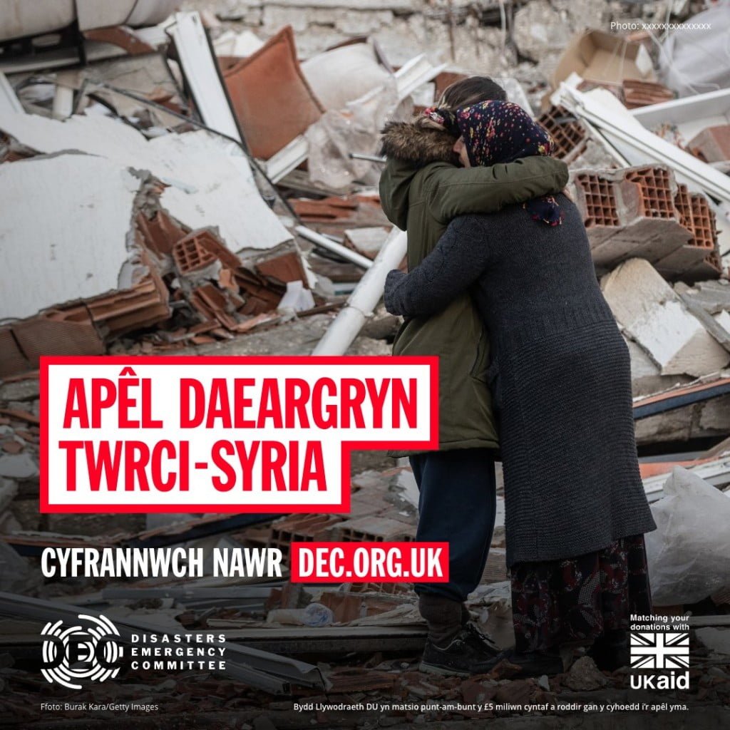 Bydd y Pwyllgor Argyfyngau Brys (DEC) yn lansio apêl fory (dydd Iau, Chwefror 9) i godi arian ar frys i helpu pobol sydd wedi eu heffeithio gan y daeargrynfeydd dinistriol yn Nhwrci a Syria, sydd wedi lladd mwy na 11,000 o bobol ac anafu llawer mwy.