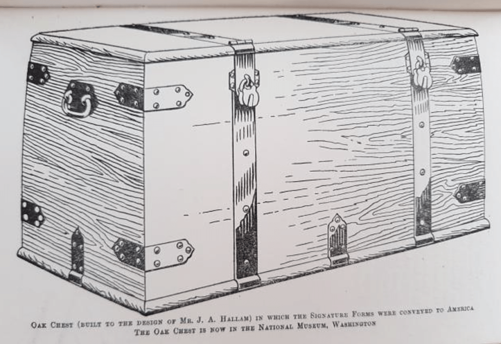 The appeal signatures in 1924 were transported from Liverpool to New York in a ‘great oak chest‘ containing 7 miles of petition sheets, according to the American Press at the time. There they were presented ‘to the women of America’ at a grand luncheon in the Biltmore Hotel, which preceded a 2 month ‘Peace Tour’ of America by a delegation of women from Wales who became known as ‘Y Heddwchwyr’ – the ‘Peacemakers’. In Washington, they met with US President Calvin Coolidge, who agreed that the petition and chest could be homed at the National Museum, now better known worldwide as the Smithsonian Institute.