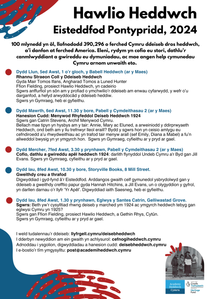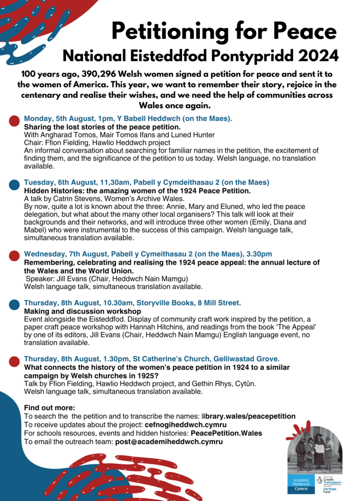 Academi Heddwch and the Women’s Peace Petition team held an extensive events programme over Eisteddfod week, with a number of talks on the Eisteddfod Maes (Peace Tent and Societies Tent), a creative workshop in Storyville Books, and a talk in partnership with Cytun (Churches in Wales) on the 1925 Welsh Churches Peace Petition.
