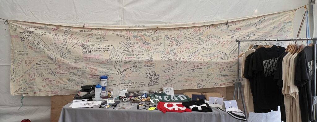 Visitors to the Peace Tent were asked to take the name of a child from Gaza who had been killed in the recent conflict, and copy the name and age of the child onto a long piece of cloth (below) in brightly coloured textile pens. They took the slip of paper with the name of the child away with them as an act of remembrance. This was a simple and moving action, illustrating the extent of the tragedy in Gaza and our grief and indignation at the loss of so much young life.
