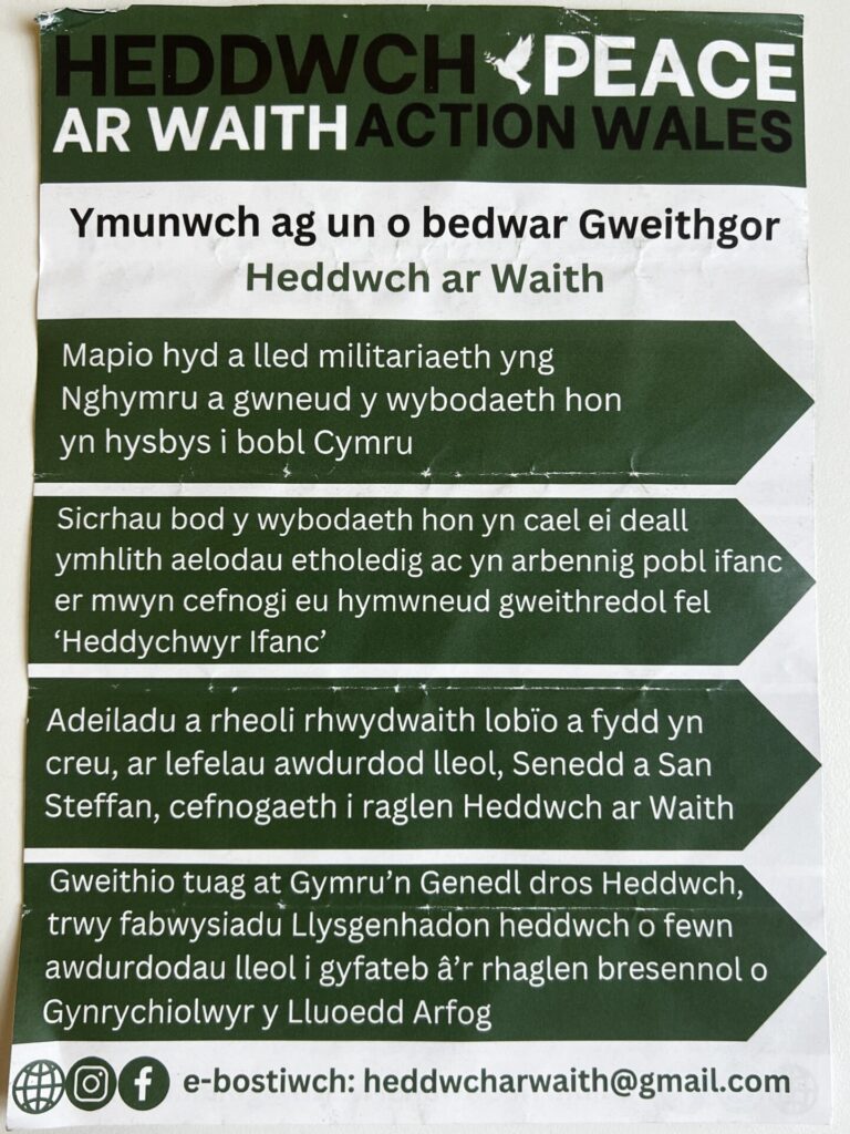 Heddwch ar Waith were promoting via the Peace Tent, their campaign and working groups on mapping militarism in Wales, and developing peace ambassadors across local authority areas: