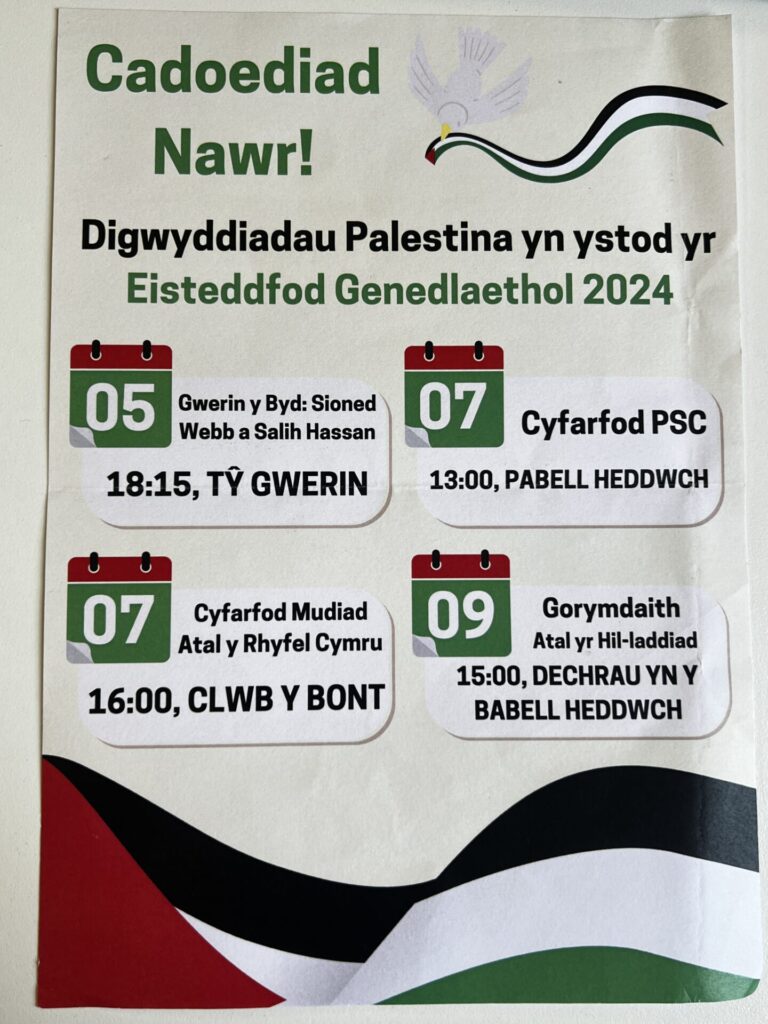 Palestine Solidarity Campaign Cymru organised a number of discussions and public events over the course of Eisteddfod week, focusing on the present conflict and humanitarian crisis in Gaza and the Occupied Territories.