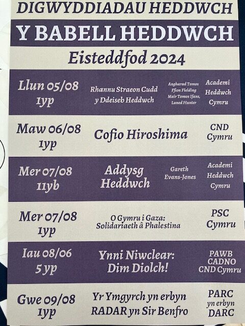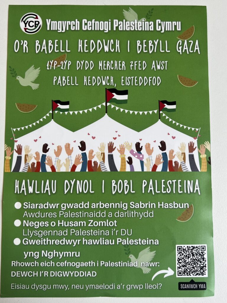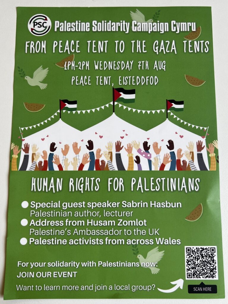 The ‘Peace Tent’ on the Eisteddfod Maes is a much-loved annual fixture of the week-long programme, with a heritage itself stretching back to the 1920s (when the Welsh League of Nations Union had a major presence and involvement in Eisteddfodau). The tent now is co-ordinated between CND Cymru (Campaign for Nuclear Disarmament), Cymdeithas y Cymod, and Academi Heddwch supported by and involving a range of organisations. There was a particularly large gathering in the Peace Tent on the Wednesday for the event ‘From Wales to Gaza: solidarity with Palestine’ (see below). CND Cymru also marked Hiroshima Day on 6th August with a Remembrance event ‘Cofio Hiroshima’.