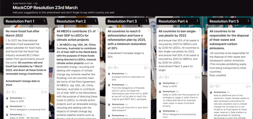 “Everyone who has taken part in MockCOP has learned something valuable about global problems and how to take action on then including me.  When I started I thought of climate change in terms of environment but these days I think it’s a real picture of how countries have industrialised, how countries rely on each other (even when they don’t want to!) and also of how inequalities underpin structural resistance to change.” Secretary General of MockCOP Amber Demetrius said.