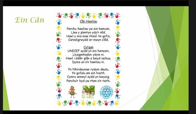 Ysgol Parc y Tywyn pupils spoke about the Globe Council at their school and how members, while working Children’s rights, created 10 rights, one for each school month. Rights included the right to education and to attend school, the right to receive care and respect and the right to meet friends and join clubs in the community.
