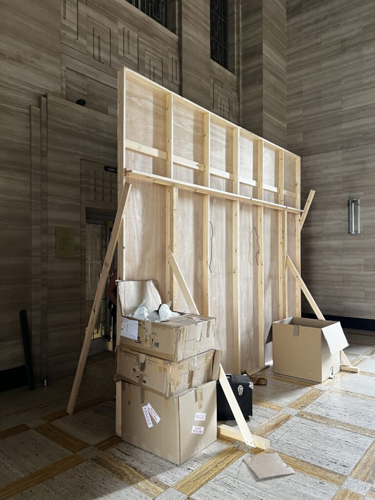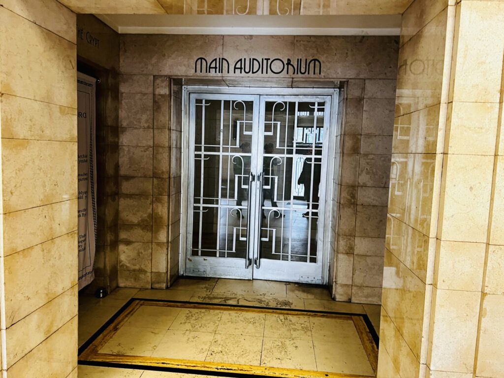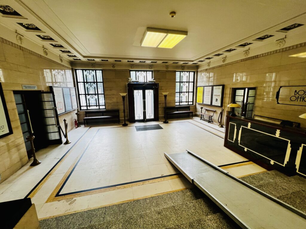 ‘Shooting’ at the Temple was undertaken over a week in July 2024, during which the Hall of Nations and Vestibule were ‘dressed’ to represent different areas of Stratford’s Royal Shakespeare Theatre in 1951: a box office, rehearsal rooms, auditorium. One of the Temple’s upstairs offices even masqueraded as Richaerd Burton’s dressing rooms / ‘green room’ for tense scenes as the actor prepared for his debut as Henry V.