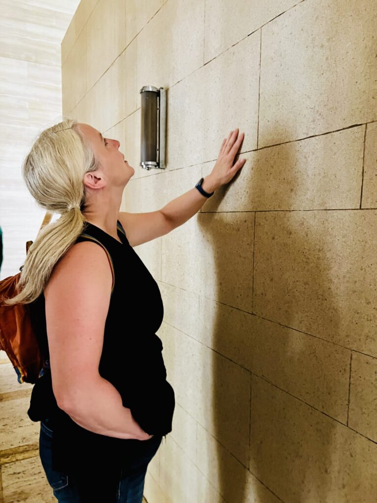 WCIA Education Manager Amber admires a wood prop created to represent a marble wall