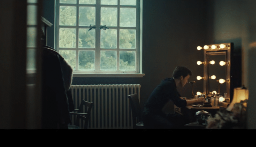 Actor Harry Lawtey in the Royal Shakespeare’s hall, aka Temple of Peace Entrance Vestibule (screenshot from official trailer)