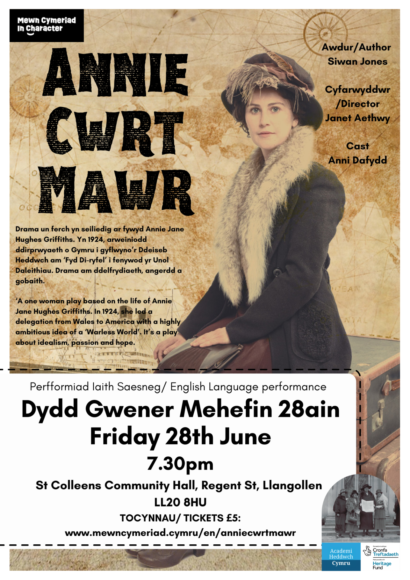 ‘A one woman play based on the life of Annie Jane Hughes Griffiths. In 1924, she led a delegation from Wales to America with a highly ambitious idea of a ‘Warless World’. It’s a play about idealism, passion and hope.