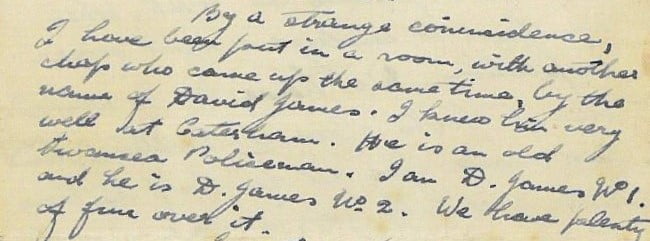 Through the correspondence he sent back home, we learn much surrounding the day to day of his life during training. In one letter, he writes of how he was coincidentally stationed in a room with another man named David James, resulting in the apt nicknames D. James 1 and D. James 2 being distributed. He himself was lucky enough to receive the D. James 1 moniker amongst the two.