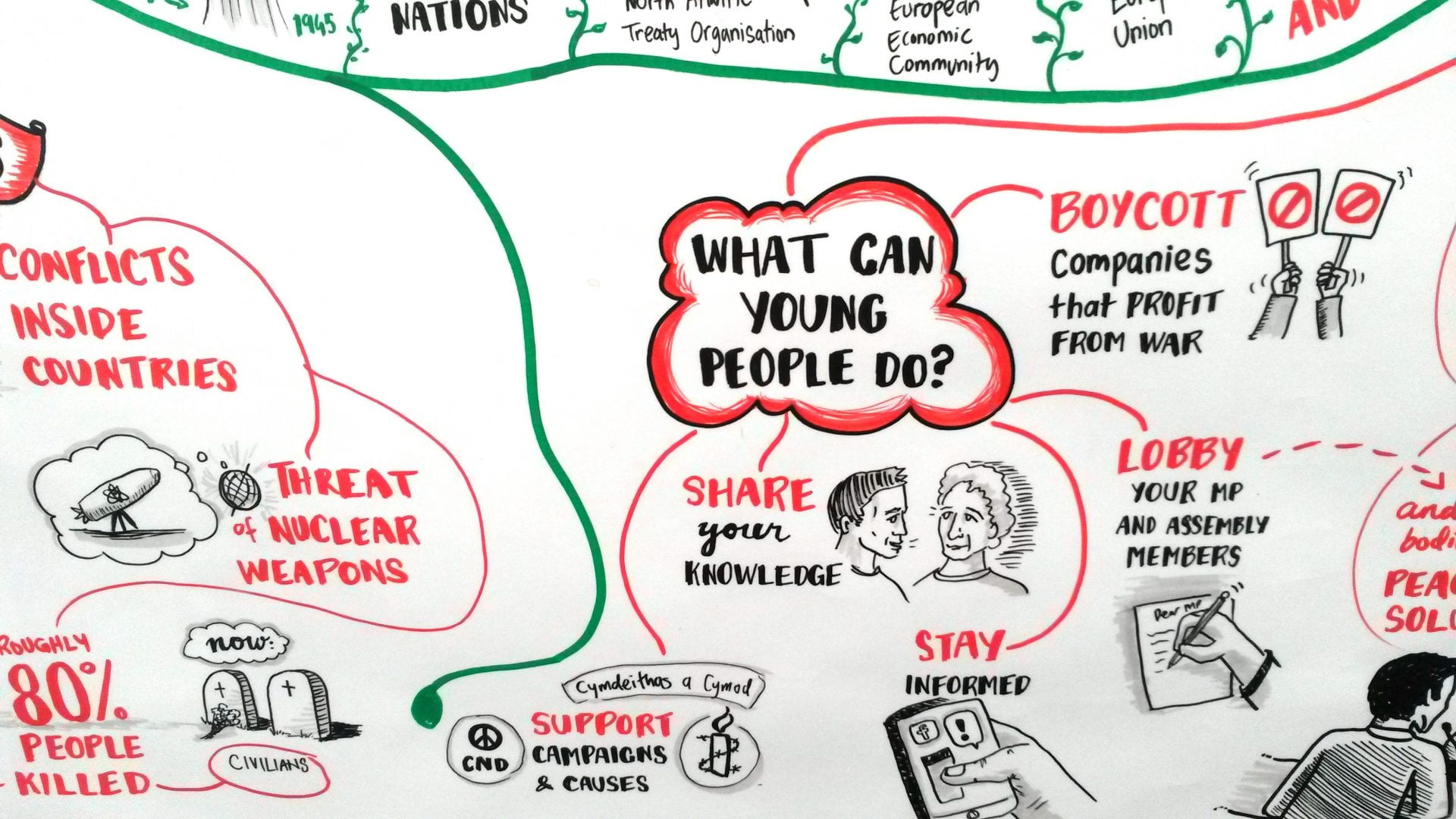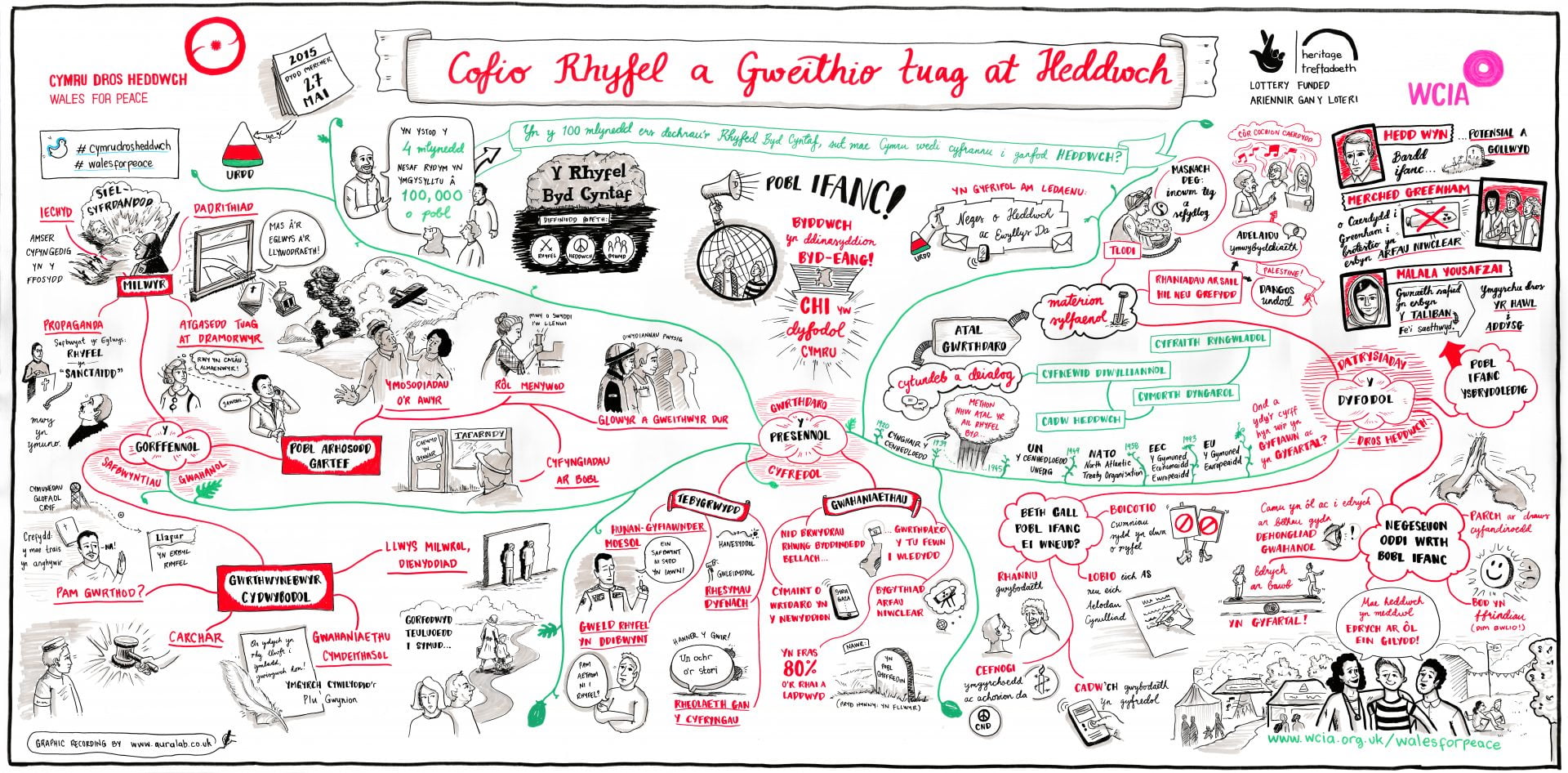 The two linen hangings on the wall opposite the council chamber were created in 2014-2015, at the launch of WCIA’s #WW100 ‘Wales for Peace’ project, by graphic artist Laura Sorvala recording ‘live’ the conversations of young people around Welsh contributions towards the search for peace over the last hundred years. The LH hanging, in Welsh, was created at the Caerphilly Urdd Eisteddfod in Spring 2015; and the RH in English at the Wales for Peace project launch in Cardiff’s Pierhead on Remembrance Day, 11th November 2014.