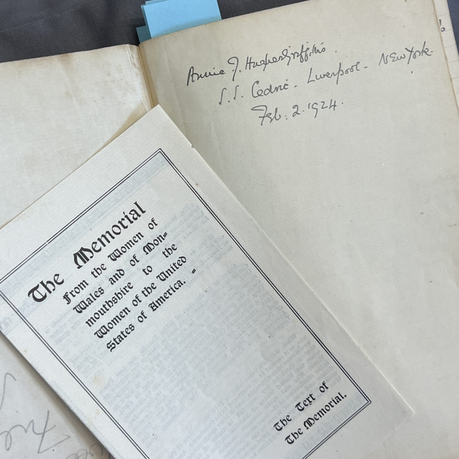 SCOPE AND CONTENT: “Journal, February-March 1924, of Annie J. Hughes-Griffiths, recording her trip to America as part of the Welsh Women’s Peace Memorial, including the outward and return voyages. The journal contains references to Leila Mégane, including the part played by Hughes-Griffiths in Megane’s wedding to T. Osborne Roberts on 21 March 1924.” National Library of Wales Archives.