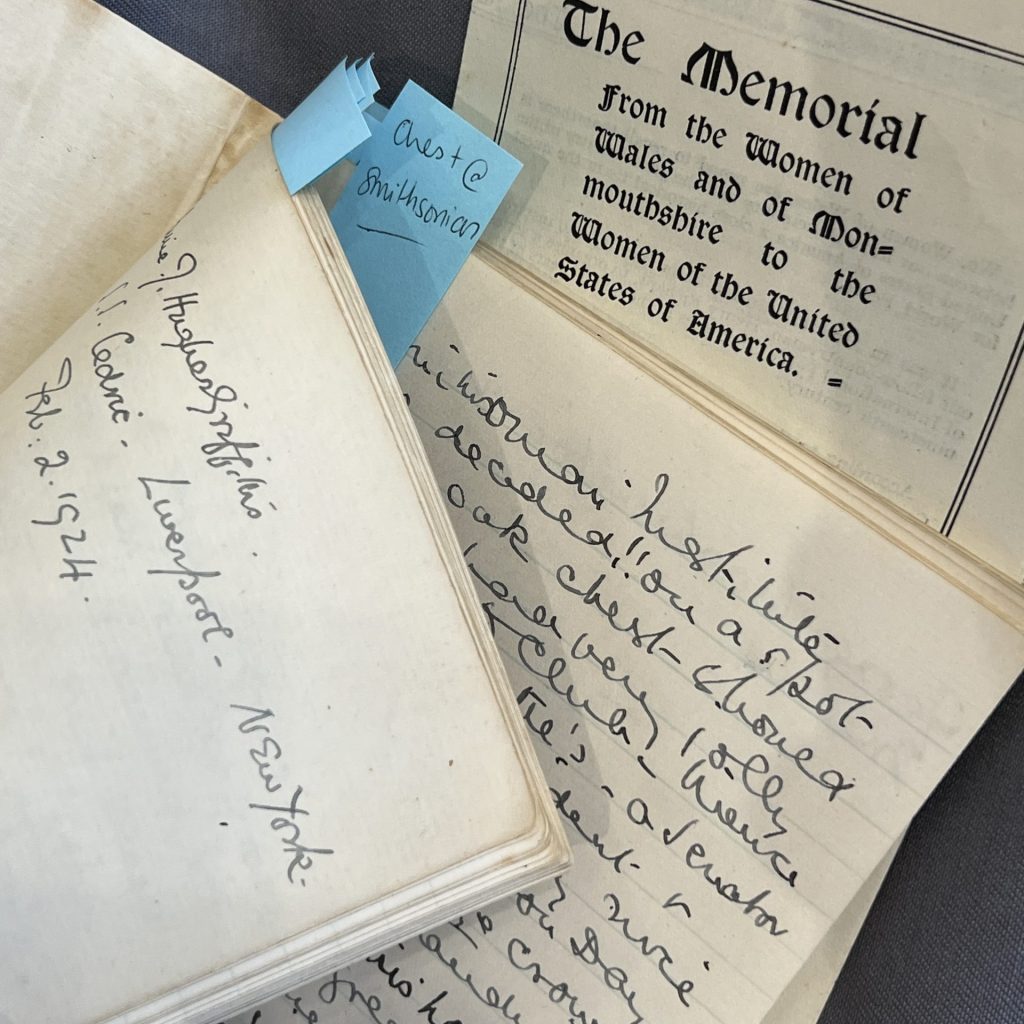Up until this point, sources and knowledge on the origins and organisation of the Women’s Peace Petition had been limited – for example, ‘Mrs Peter Hughes Griffiths’ had so far been discoverable only by her husband’s name. The value of her diary as historical ‘primary source’ material was quickly recognised. The pages were digitised with the aim of transcribing and uncovering the story of the visit to America – to understand more about the petition itself, and the campaign behind it. WCIA appealed for volunteers to help uncover ‘the story of Annie’s Diary’.
