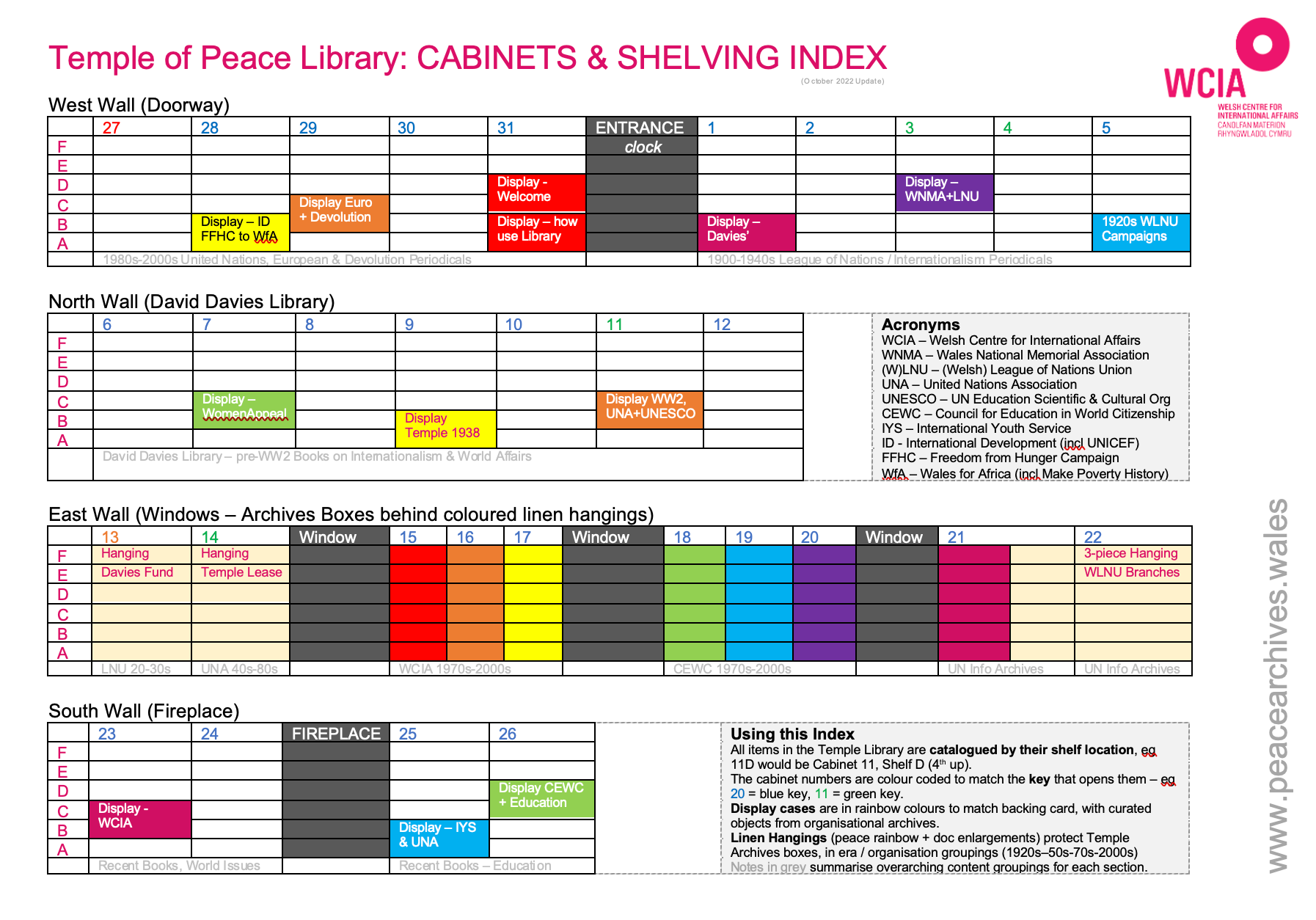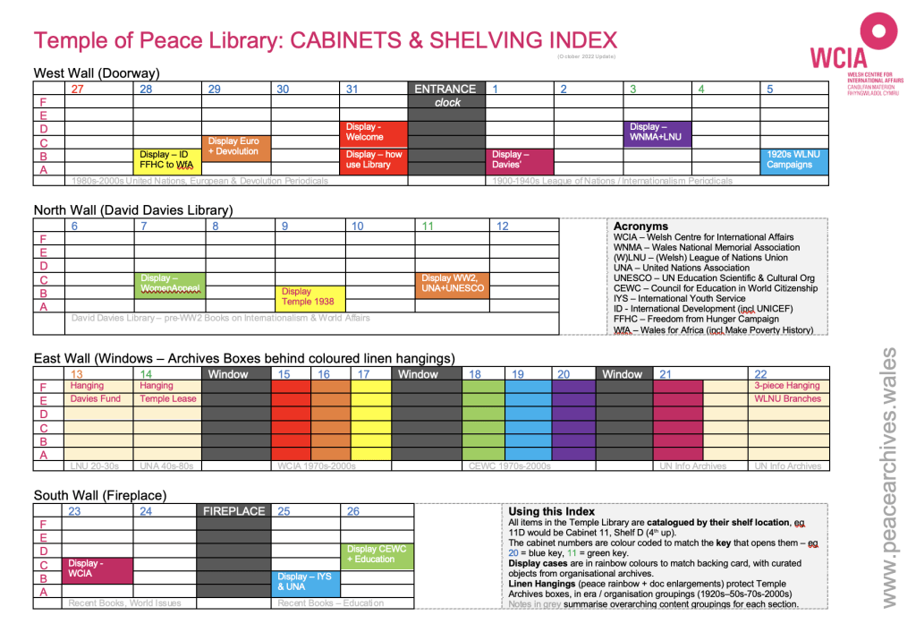- Temple Archives (opposite entrance door, behind linen hangings) – these are organised in roughly chronological order in 4 sections: a) League of Nations, 1920s-46 b) UNA 1946-2010 c) WCIA25 (first 25 years, 1973-1998) d) WCIA50 (post devolution era, 1998-2023).