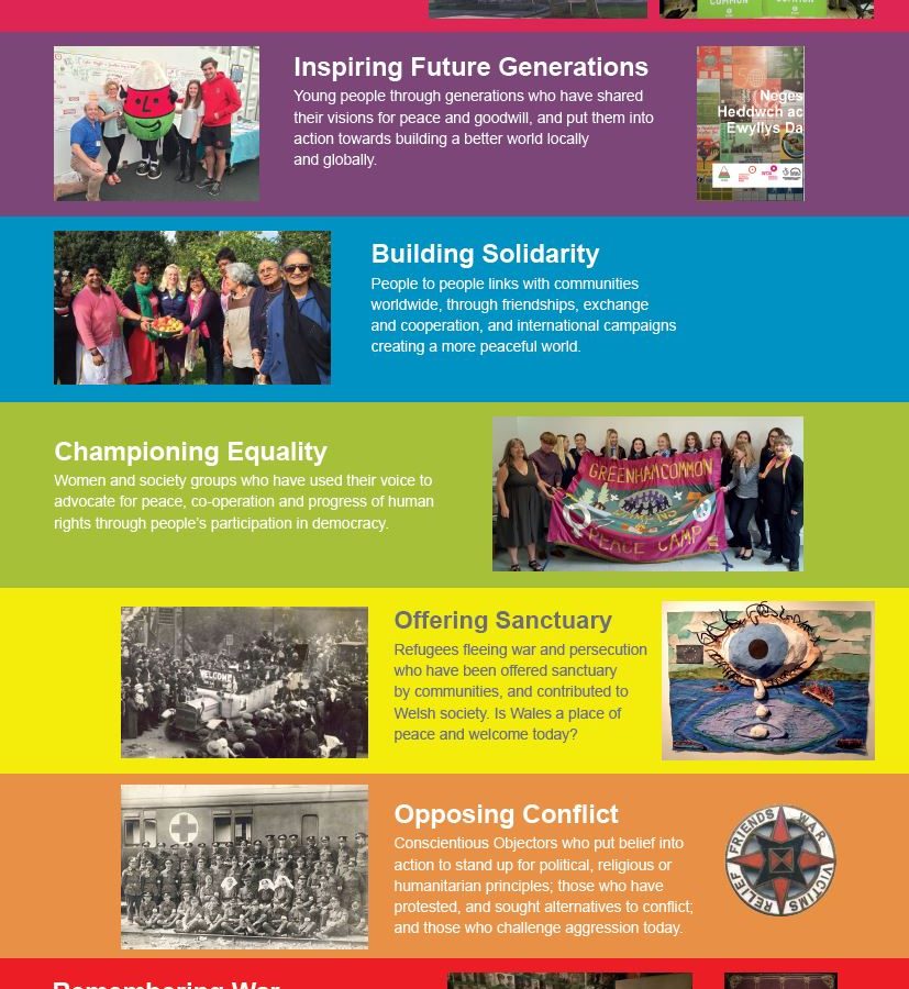 Wales has a long and proud history of grassroots-driven, internationalist action for social justice, peace and cooperation with fellow cultures and peoples worldwide. WCIA’s ‘Wales for Peace’ exhibition and ‘Timeline of Peacemakers’ – now permanently installed in Wales’ Temple of Peace & Health in Cardiff’s Civic Centre – explores Wales’ Peace heritage through 7 key themes, represented by the colours of the 1960s rainbow peace flag: each the inspiration to generations of Welsh internationalists in campaigning to build a better world.