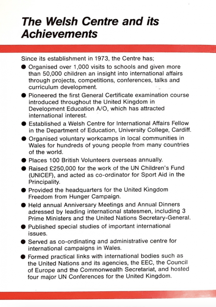 From the 1950s, the United Nations Association had been the world’s leading post-WW2 body, “stirring the conscience of a new generation” as David Melding (ex WCIA staff / recent Member of Senedd) described. But by the 1960s, UNA Wales was in sharp decline, overtaken by issue-based movements such as CND; and with the loss of traditional fundraising mechanisms such as mass membership, community collections and big philanthropic donors. Conversely however, it was taken for granted by the British Public and politicians that “somebody must do” all the educational, volunteering, campaigning, policy and advocacy, humanitarian aid and global partnerships work on which Britain’s – and Wales’ – global relationships were based, and for which the Temple of Peace had been founded. To survive, the Temple of Peace had to become an institution in its own right.
